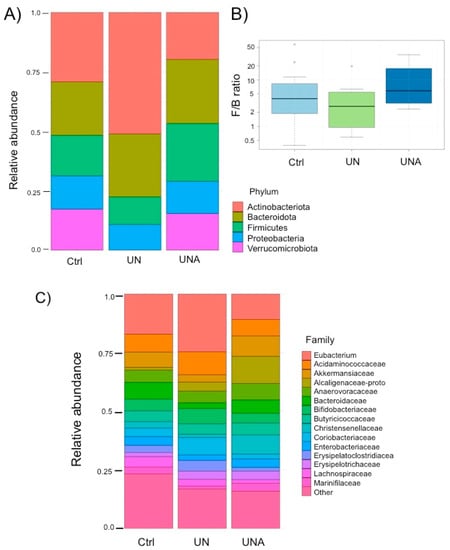 (A) Relative abundance in gut microbiota at phylum level; (B) Ratio of Firmicutes to Bacteroidetes (B/F). Significant differences were calculated using the non-parametric Wilcoxon test and non-significant differences were detected. (C) Relative abundance in gut microbiota at family level. Ctrl = control group of children with normal height-for-age; UN = undernutrition group with low height-for-age; UNA = undernutrition group after three months of amaranth consumption.