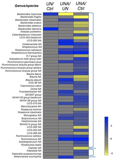 Heatmap of differential ASVs observed between: UN/Ctrl, undernutrition group (U/N) vs. control group (Ctrl); UNA/UN, undernutrition group after amaranth consumption (UNA) vs. undernutrition group at the beginning of assay (UN); UNA/Ctrl, undernutrition group after amaranth consumption (UNA) vs. control group (Ctrl). Values were determined using LogFC, at p < 0.05 and FDR < 0.1.