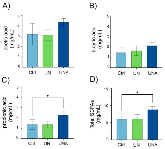 Short-chain fatty acid (SCFA) levels in children’s feces samples. One-way ANOVA was carried out followed by Tukey’s post hoc test. (A) acetic acid; (B) butyric acid; (C) propionic acid; (D) Total SCFA. Data is presented as mean of mg/mL ± standard deviation. Asterisk shows significant differences at p < 0.05. Ctrl = control group of children normal weight-for-age; UN = undernutrition children group with low height-for-age; UNA = undernutrition children group after three months of amaranth consumption.