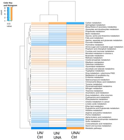 Heatmap of predicted functions of the gut microbiome by Tax4fun2 evaluated according to the differences in the Kyoto Encyclopedia of Genes and Genomes (KEGG) pathway. Differences in the KEGG pathway: undernutrition group (UN) vs. control children (Ctrl); undernutrition group after amaranth consumption (UNA) vs. undernutrition group at the beginning of assay (UN); undernutrition group before amaranth consumption (UN) vs. control group (Ctrl).