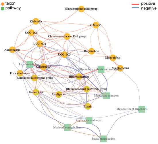 A network of correlations with metabolic activities was obtained and as shown in Figure 8, Akkermansia appeared to be an important species in controlling Ruminococcus, Bacteroides, and Blautia. There was also a positive relation with Klebsiella and E. hallii. Akkermansia also showed a positive correlation with species from the Oscillospiracea family, such as UCG-005, 003, and 002. The UCG strains regulate Christensenellaceae R-7 and Butyrivibrio, which is an important species in lipid metabolism. These groups of bacteria have a role in the regulation of nucleotide and terpenoid metabolism, transport, signal transduction, and replication and repair.