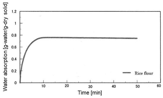 The water absorption characteristic curve of rice flour is shown in Figure 1. The saturated water absorption of rice flour reached 0.76 g in 8 min, and half the saturated water amount was absorbed in 77 s (the water absorption rate). Matsuki et al. compared the water absorption of rice flour milled by four different milling methods and reported that wet-airflow-milled rice flour had the highest water absorption rate and lowest water absorption [33]. The water absorption and water absorption rate of the rice flour used in this study were almost equal to those of the rice flour milled by wet-airflow milling in the study by Matsuki et al. Shoji et al. also reported the possibility that the water absorption of rice flour is a slow process, in which water absorption by capillary attraction occurs first, followed by penetration and diffusion. During penetration into the rice flour, the water on the surface of the rice flour that penetrates the voids causes the starch to swell. In rice flour with a high degree of starch damage, the swollen starch area resists water movement, consequently reducing the water absorption rate. The starch damage level of the rice flour used in this study was lower than that of wet-airflow-milled rice flour, suggesting that the water absorption rate was higher [33].