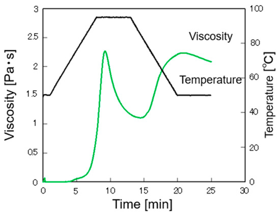 The RVA curve of rice flour is shown in Figure 2, and the gelatinization characteristics are shown in Table 1. The rice flour used in this study had a gelatinization temperature of 71 °C, which is higher than the upper limit of the reported gelatinization temperature range of 60.6–64.3 °C for low-amylose rice [42]. However, the gelatinization temperatures of high- and medium-amylose rice have been reported to be 64.8–65.2 °C and 66.0–80.1 °C, respectively [43], indicating that the prepared rice flour is similar to that from medium-amylose rice.