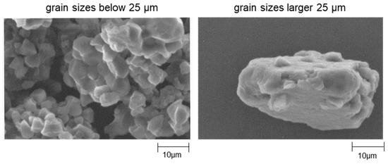 Particle sizes below 25 µm had a compound grain structure with small aggregates on the surface, whereas those larger than 25 µm had fewer small aggregates and a smooth surface.