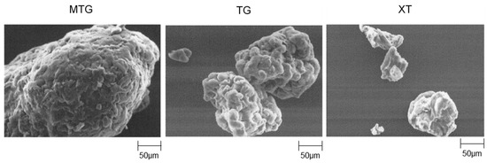 Furthermore, the scanning electron micrographs of the polysaccharide thickeners used in this study are shown in Figure 4. MTG had larger particles with smoother surfaces compared with those of TG. The particles of XT were smaller and more angular in shape than those of TG, indicating that, although both MTG and TG originated from tamarind seed gum, they possessed different microstructures.