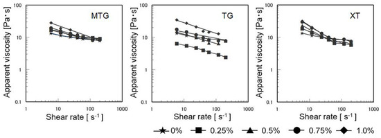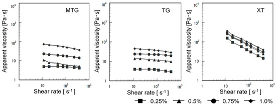 Figure 5 shows the shear rates of the polysaccharide thickener solutions, which exhibited nearly Newtonian fluid behavior in MTG and TG. The apparent viscosity increased with increasing concentration. At 25 °C, the apparent viscosity of XT decreased with increasing shear rate and indicated shear-thinning flow, which was not significantly affected by concentrations of >0.5%. These results are consistent with previously reported results [45,46].