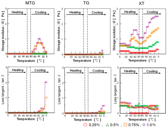 The storage modulus of MTG increased when the temperature decreased from 80 to 40 °C but decreased upon cooling from approximately 40 to 5 °C. All concentrations of TG showed a constant storage modulus with increasing temperature and little change with decreasing temperature, while the storage modulus of XT increased with increasing concentration and decreasing temperature from 80 to 5 °C.