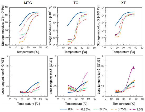 The temperature dependence of the dynamic viscoelasticity of the batter with each polysaccharide thickener is shown in Figure 8. The storage modulus was lower for all the polysaccharide thickeners compared to those of the control. The storage modulus of the MTG-added batter decreased with increasing concentration, but the opposite trend was observed for the TG-added batter. The storage modulus of the XT-added batter was almost unaffected by changes in its concentration. The tanδ of the MTG-added batter increased above 35 °C but was lower than that of the other polysaccharide thickeners, indicating a larger storage modulus. The TG- and XT-added batters showed a similar trend. Maninder reported that tamarind seed gum underwent a large viscosity breakdown, with a minor drawback: it was sticky but not retrogradation-resistant [47]. The viscosity of the solution may have influenced these properties. However, the MTG-added batter exhibited a lower tanδ and larger elastic modulus than did the TG- and XT-added batters, regardless of the additive concentration. This suggests that the MTG solution tends to gel at approximately 40 °C and that this property is also reflected in the dynamic viscoelasticity of the batter.