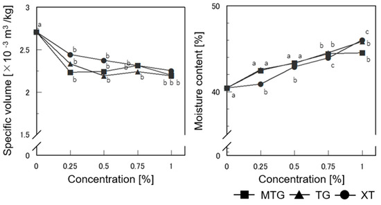 The color of the bread showed a tendency for redness and yellowness to decrease with increasing concentrations of TG and MTG additions, which differed for XT. Regarding the color of gluten-free rice-flour bread, it has been reported that the L and a values are lower when the specific volume of the bread is lower [23]. This factor is thought to be related to the retention of air bubbles during baking and the texture of the bread. In this study, as shown in Figure 9, the specific volume of the bread decreased with the addition of thickened polysaccharides, suggesting that the lower quantity of air bubbles in the bread affected the lower a value. Additionally, the amino-carbonyl reaction between rice-flour protein and added sugar during baking was suppressed at higher concentrations of thickened polysaccharides, which may be due to the increased dough viscosity and different properties of the thickened polysaccharides.