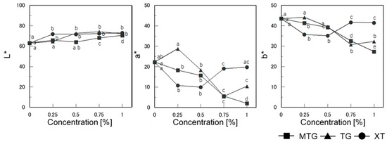 The chromaticity on the surface of the gluten-free rice-flour bread baked with the polysaccharide thickeners is shown in Figure 11. The L* (lightness) value was slightly higher than that of the control for all polysaccharide thickener additions (p < 0.05), but there was no significant difference between the concentrations. The a* (redness) and b* (yellowness) values decreased with increasing polysaccharide concentration in the MTG-added bread (p < 0.05), but increased for the 0.25% TG-added bread and decreased at higher concentrations of TG (p < 0.05). The b* values of the XT-added bread decreased at 0.25% and 0.5% additions (p < 0.05), showing a different trend from that of the TG-added bread.