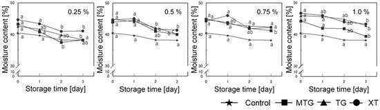 The effect of storage on the moisture content of gluten-free rice-flour bread with added polysaccharides is shown in Figure 13. The moisture content tended to increase with the addition of polysaccharide thickeners on the day of baking compared to that of the control. The addition of thickener tended to result in a higher value than that of the control up to the first day, but on the third day, only the XT-added bread showed a moisture-retention effect. However, at polysaccharide thickener concentrations of 0.5% or higher, all polysaccharide thickeners showed improved moisture retention compared with that of the control. MTG and TG have many hydroxyl groups and hydrophilic side chains that bind strongly to water [48], making them effective in increasing the moisture content. Furthermore, TG and XT have small particles and large surface areas, while MTG has large particles and a small surface area, suggesting that this may influence water retention.