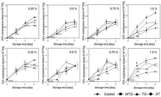 Figure 14 shows the effect of storage on the stress at 25% and 70% compression of the gluten-free rice-flour bread with the polysaccharide thickener. The 25% compression stress of the bread with MTG was lower than that of the control until the first day at 0.25% and 0.5% MTG concentrations. However, the value increased rapidly on the second day (p < 0.05). The MTG-added bread was softer than the control until day 2 at 0.5% MTG concentration and until day 1 at 0.75% MTG concentration, indicating that the addition of MTG inhibited the hardening of the inner phase of the bread. The TG-added bread showed the lowest value at 0.5% TG concentration, which suppressed the hardening of the bread. Furthermore, the XT-added bread showed a smaller value at 1.0% XT concentration than did the control and TG-added bread, which suppressed the hardening of the bread. The values of the XT-added bread indicated that higher concentrations have a greater effect on hardening inhibition throughout the 3-day storage period.