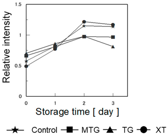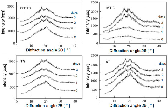 To investigate whether retrogradation caused the hardening of the bread, the relative intensities of gluten-free rice-flour bread with 0.5% polysaccharide thickener were calculated from the X-ray diffraction pattern (at 2θ = 17°; Figure 15) and are shown in Figure 16. Compared with the control, the bread with MTG showed lower relative intensities after 2 days. Similar to those of the MTG-added bread, the relative intensities of the TG-added bread were low from the second day onward. The relative intensity of the XT-added bread was higher than those of the MTG- and TG-added breads and near that of the control. This indicates that at 0.5% concentration, the addition of XT to bread has no inhibitory effect on starch retrogradation. It has been reported that TG inhibits the starch retrogradation caused by the rearrangement of amylose and amylopectin by entanglement with starch molecules [49]. The same rationale for the inhibitory effect on starch retrogradation was considered to be true in this study.