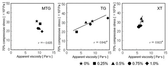 A positive correlation was observed between the apparent viscosity of the batter and the stress on the bread at 70% compression at TG and XT (Figure 17). Specifically, unlike that for the other polysaccharide-added breads, the apparent viscosity of the batter differed significantly for the TG-added bread, depending on the concentration of TG.