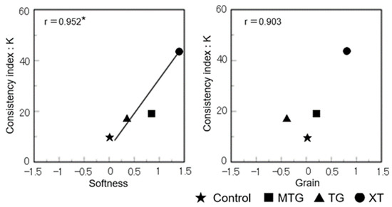A positive correlation was obtained between the batter viscosity and the softness of the bread in the sensory evaluation, indicating that the higher the batter viscosity, the softer the bread (p < 0.05) and the finer the grain texture (p < 0.1) (Figure 18).