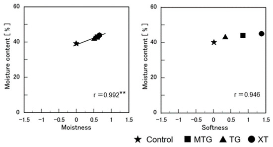 Relationship between water content and sensory evaluation results of gluten-free rice-flour breads. ** Correlation is significant at p < 0.01.