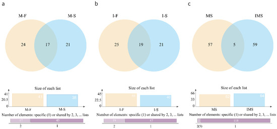 Venn diagram of VOCs detected at two concentrations using two methods; (a) comparison of M-F and M-S; (b) comparison of I-F and I-S; (c) comparison of HS-SPME-GC-MS and HS-GC-IMS. M-F: substances in 10−4 concentration of S. aureus-contaminated samples detected by HS-SPME-GC-MS.; M-S: substances in 10−6 concentration of S. aureus-contaminated samples detected by HS-SPME-GC-MS; I-F: substances in 10−4 concentration of S. aureus-contaminated samples detected by HS-GC-IMS; I-S: substances in 10−6 concentration of S. aureus-contaminated samples detected by HS-GC-IMS.
