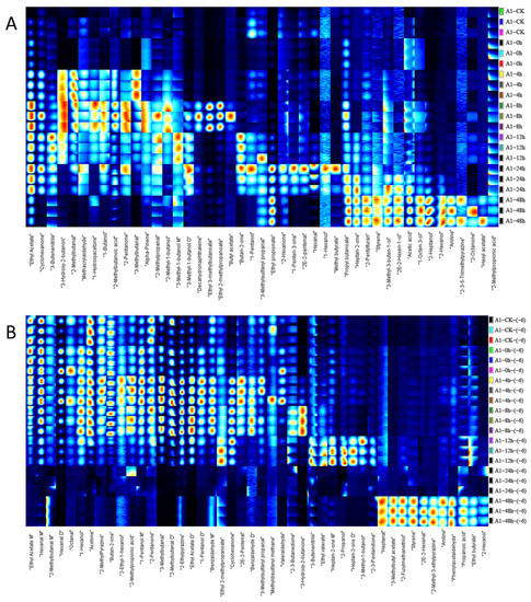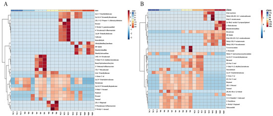 Cluster heat map of volatile components of chicken meat at different incubation times by HS-SPME-GC-MS; (A) substances detected at 10−4 concentration of S. aureus-contaminated samples; (B) substances detected at 10−6 concentration of S. aureus-contaminated samples; “CK” served as a blank control.