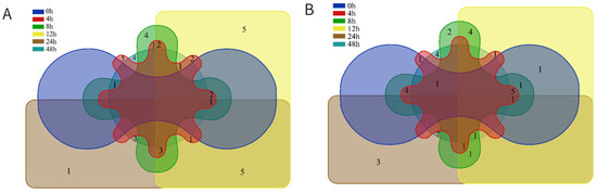 Venn diagram of six time points for volatile components of chicken meat by HS-SPME-GC-MS; (A) 10−4 concentration bacterial suspension inoculation group; (B) 10−6 concentration bacterial suspension inoculation group.