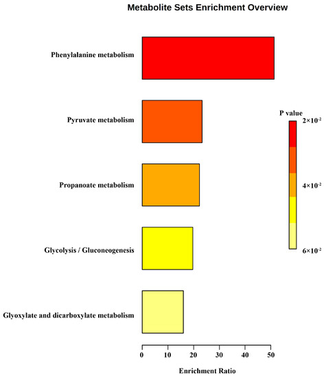 To clarify the metabolite information of S. aureus, all compounds detected by both methods were subjected to KEGG metabolic enrichment. These volatiles focused on phenylalanine metabolism, pyruvate metabolism, propanoate metabolism, glycolysis/gluconeogenesis, glyoxylate, and dicarboxylate metabolism (Figure 5). This indicates that S. aureus metabolism in chicken meat is dominated by basic metabolism. Some of the metabolites with more significant changes in relative abundance were retrieved from the KEGG database as shown in Table 1.