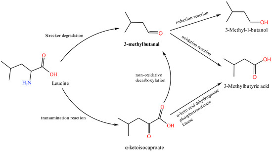 Aldehydes are mainly derived from the hydrolysis of triglycerides and the fatty acid metabolism [13] and can also occur during Merad-induced degradation of amino acids [30]. Due to their high volatility and low threshold, aldehydes contribute significantly to the characteristic flavor of cooked chicken and dry-cured ham [12,30]. The relative levels of the three potentially characteristic aldehydes 2-methylbutanal, 3-methylbutanal, and heptanal detected in this study all showed a trend of increasing and decreasing over time. The first increase was mainly due to the oxidation of lipids in chicken meat, and the later decrease in content may be because of the rapid oxidation of these aldehydes to acids and subsequent esterification by ethanol [34]. KEGG metabolite searches revealed that the upstream substances of 2-methylbutanal and 3-methylbutanal are 3-methyl-2-oxopentanoic acid and 3-methyl-1-butanol, respectively. 3-Methyl-1-butanol is converted to 3-methylbutanal by 3-methylbutanal reductase. 3-Methylbutanal and 2-methylbutanal are also amino acid modifiers and intermediates for the formation of many esters and branched ketones, and 3-methylbutanal is the fingerprint compound of S. aureus [35]. 3-Methylbutanal can also be formed by the leucine metabolism (Figure 6). In the metabolism of S. aureus, 3-methylbutanal can be reduced to 3-methyl-1-butanol by alcohol dehydrogenase or oxidized to 3-methylbutyric acid by aldehyde dehydrogenase [35]. According to Hu et al. [35], 3-methylbutanal is an aldehyde specifically produced by S. aureus. The concentration of this substance increased significantly early in the culture, in agreement with this study. Heptanal is mainly produced by the oxidation of arachidonic acid [12]. Heptanal contributes to fatty and green herbal odors but is very unpleasant when its concentration exceeds the odor threshold [28,29]. 3-Methylbutanal in chicken meat in this experiment may be obtained by 3-methyl-1-butanol esterification or the leucine metabolism, which is later oxidized into 3-methylbutyric acid or reduced into 3-methyl-1-butanol. Heptanal may be produced by the oxidation of arachidonic acid. It has a negative impact on chicken meat flavor when its odor threshold is exceeded.