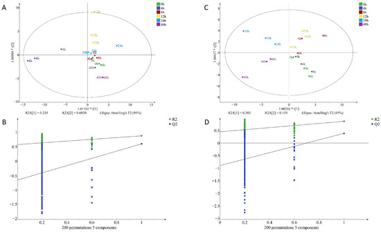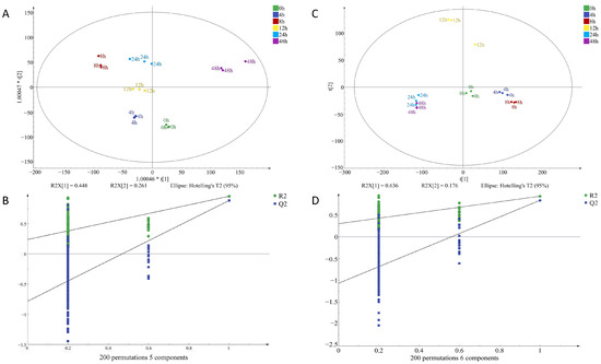 OPLS-DA of volatile organic compounds in chicken meat contaminated with Staphylococcus aureus at different incubation times by HS-SPME-GC-MS; (A) factor loading diagram at 10−4 concentration of S. aureus-contaminated samples; (B) displacement test results at 10−4 concentration of S. aureus-contaminated samples; (C) factor loading diagram at 10−6 concentration of S. aureus-contaminated samples; (D) displacement test results at 10−6 concentration of S. aureus-contaminated samples.
