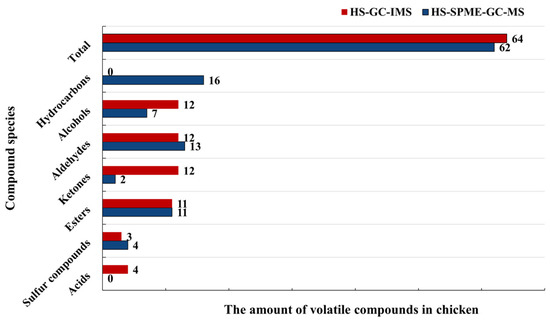 Both HS-SPME-GC-MS and HS-GC-IMS can distinguish volatiles in chicken meat at different treatment times. However, HS-GC-IMS provided a more visual representation of the differences in volatile components in chicken meat. As shown in Figure 9, the number of alcohols and ketones identified by HS-GC-IMS was much higher than those determined by HS-SPME-GC-MS, while the number of sulfur compounds identified by HS-SPME-GC-MS was higher than those identified by HS-GC-IMS. Aldehydes and esters were detected in equal amounts by both methods. In addition, HS-GC-IMS detected 6 acids that were not detected by HS-SPME-GC-MS, and HS-SPME-GC-MS detected 16 hydrocarbons that were not detected by HS-GC-IMS. HS-GC-IMS was more sensitive to trace small molecule volatile compounds, which exhibits relatively low boiling points [13]. The combination of HS-SPME-GC-IMS and HS-GC-MS allowed for more comprehensive detection of volatiles in contaminated chicken meat.
