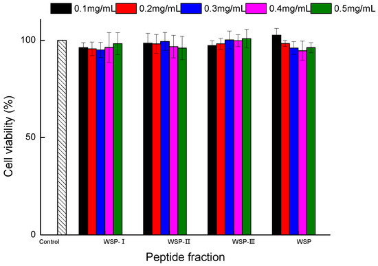 The effects of WSP-Ⅰ, WSP-Ⅱ, WSP-Ⅲ, and WSP on cell viability were evaluated using the MTT assay. MTT assay is considered as the most commonly used and effective international method for detecting cell survival and growth [7]. The results are depicted in Figure 1, there was no significant difference between each peptide fraction group and control group (p > 0.05), and the cell survival rate of all groups was still above 90%. The results indicated that the five tested concentrations (0.1–0.5 mg/mL) of four peptide fractions would not evoke significant changes in the cell viability of Caco-2 cells and will not damage the integrity of the cells. This is consistent with the results of Huma et al. [4] and Rafiq et al. [7], who reported that the cheese peptides had no toxic effect on cell viability. Thus, the nontoxic concentrations (0.1–0.5 mg/mL) were used in the following study.