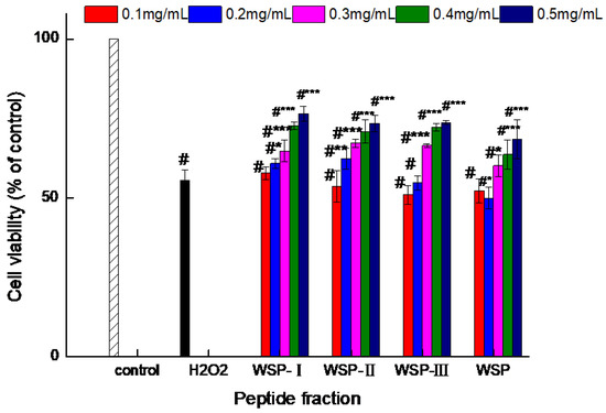The protective effect of peptide fractions on viability (%) in H2O2-induced Caco-2 cells. Control: cells treated with medium only; H2O2: cells treated with medium and 0.9 mM H2O2. Values are expressed as the mean ± standard deviation, n = 6. # Extremely significant difference from the control group (p < 0.001); * Significant difference from the H2O2-induced group (p < 0.05); ** Significant difference from the H2O2-induced group (p < 0.01); *** Extremely significant difference from the H2O2-induced group (p < 0.001).