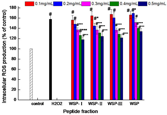 Effect of peptide fractions on intracellular ROS production (%) in H2O2-induced Caco-2 cells. Control: cells treated with medium only; H2O2: cells treated with medium and 0.9 mM H2O2. Values are expressed as the mean ± standard deviation, n = 6. # Extremely significant difference from the control group (p < 0.001); * Significant difference from the H2O2-induced group (p < 0.05); *** Extremely significant difference from the H2O2-induced group (p < 0.001).