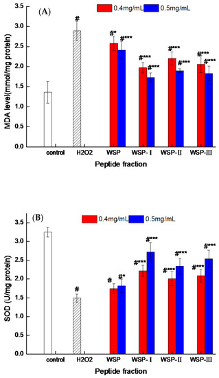 Firstly, the level of MDA was measured to evaluate the antioxidant capacity of WSP-Ⅰ, WSP-Ⅱ, WSP-Ⅲ, and WSP on oxidative-damaged cells. MDA is one of the final products of lipid peroxidation, which can be used as an effective biomarker for evaluating oxidative stress status [38]. As shown in Figure 4A, the level of MDA in Caco-2 cells treated with H2O2 alone was significantly increased in comparison to the control group, indicating the occurrence of lipid peroxidation in damaged cells. However, 24 h presupplementation of four peptide fractions at 0.4 mg/mL and 0.5 mg/mL significantly downregulated the overproduction of MDA in H2O2-induced cells (p < 0.05), indicating that four peptide fractions can attenuate cellular lipid peroxidation and ROS-mediated membrane damage. In addition, WSP-I displayed a higher inhibitory effect when compared to WSP-II, WSP-III, and WSP.