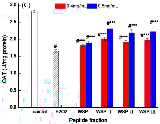 Effect of peptide fractions on MDA level (A), SOD activity (B), CAT activity (C) in Caco-2 cells. Control: cells treated with medium only; H2O2: cells treated with medium and 0.9 mM H2O2. Values are expressed as the mean ± standard deviation, n = 6. # Extremely significant difference from the control group (p < 0.001); * Significant difference from the H2O2-induced group (p < 0.05); *** Extremely significant difference from the H2O2-induced group (p < 0.001).