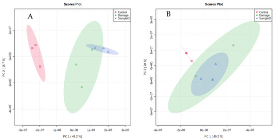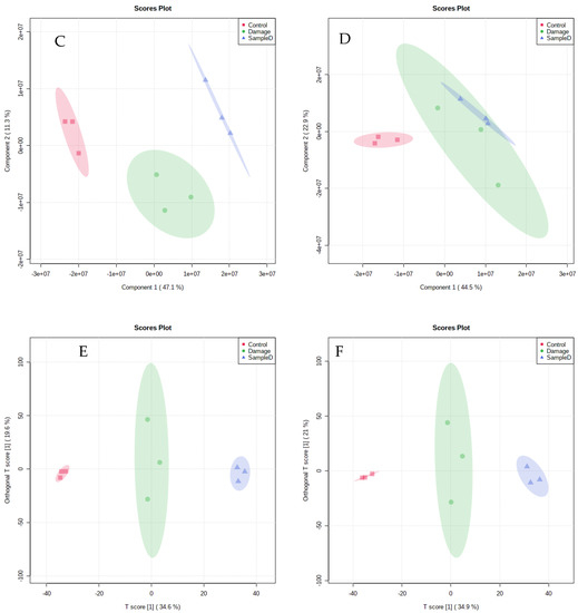 The score plot of PCA (A,B), PLS−DA (C,D), and OPLS−DA (E,F). (A,C,E) positive; (B,D,F) negative. Control: control group; Damage: damage group; SampleD: sample protection group.