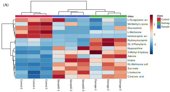 Hierarchical clustering heat maps of metabolites expression of different groups (A) and heat map of metabolite correlation (B). Control: control group; Damage: damage group; SampleD: sample protection group.
