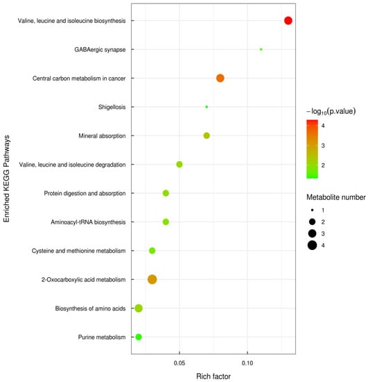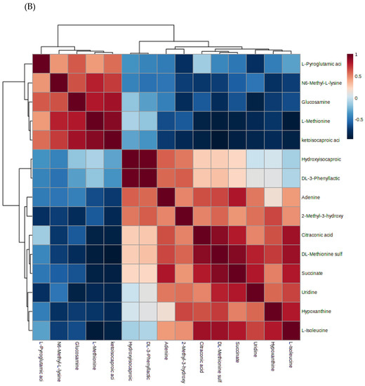 The metabolomics analysis was performed according to the method of Yao et al. [35] and Shao et al. [36] with modification. The Agilent 1290 Infinity LC Ultra-High-Performance Liquid Spectroscopy (UHPLC) HILIC column was used for the separation of the sample. Column temperature: 25 °C; flow rate: 0.5 mL/min; injection volume: 2 µL. The mobile phase consisted of A (water + 25 mM ammonium acetate + 25 mM ammonia) and B (acetonitrile). The gradient elution procedure was as follows: 0–0.5 min, 95% B; 0.5–7 min, B changes from 95% to 65%; 7–8 min, B changes from 65% to 40%; 8–9 min, B was maintained at 40%; 9–9.1 min, B changes from 40% to 95%; 9.1–12 min, B was maintained at 95%. The sample was placed in the 4 °C autosampler during the entire analysis.