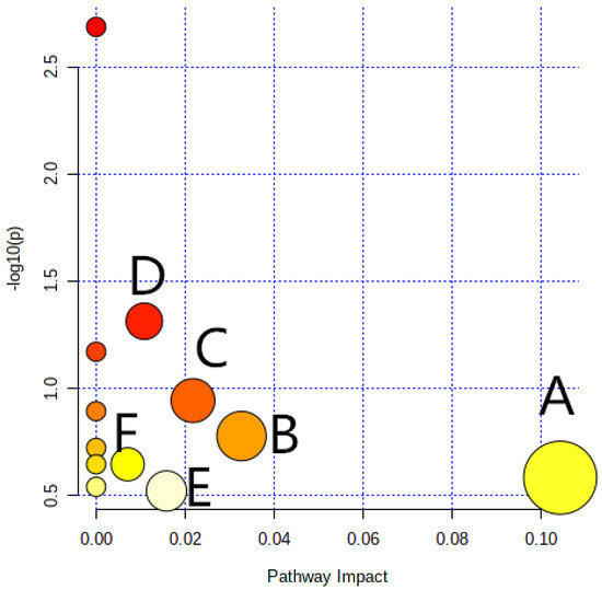 Overview of pathway analysis from pathway topology analysis. A: Cysteine and methionine metabolism; B: Citrate cycle (TCA cycle); C: Purine metabolism; D: Valine, leucine, and isoleucine degradation; E: Pyrimidine metabolism; F: Glutathione metabolism.