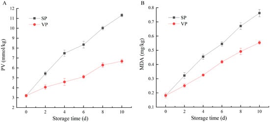 Changes in (A) peroxide value (PV) and (B) malondialdehyde (MDA) content of simple-packaged (SP) and vacuum-packaged (VP) pike eels during chilled storage (n = 3).