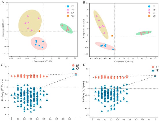 In this work, the PLS-DA model was performed to compare the overall difference of the lipid composition in FE, SP, and VP pike eel samples. As shown in Figure 3A,B, six replicated quality control (QC) samples were closely clustered together and effectively distinguished from FE, SP, and VP groups, verifying the accuracy and stability of instrument platform detection. The FE, SP, and VP samples were clearly represented in the scatter plots as three well-separated clusters. The parameters of R2X, R2Y, and Q2 were calculated as 0.758, 0.981, and 0.895 in negative ion mode and 0.775, 0.992, and 0.942 in positive ion mode, respectively. The relatively high levels of the R2 factor and Q2 coefficient indicated that the PLS-DA models constructed in this current study were stable and reliable with good predictive ability [31]. In addition, the robustness of PLS-DA models was further evaluated by the permutation score plots (Figure 3C,D). The intercepts of R2 (0.0, 0.7905) and Q2 = (0.0, −0.8047) in negative ion mode, and R2 = (0.0, 0.84) and Q2 = (0.0, −0.5852) in positive ion mode confirmed the models were statistically valid without overfitting. In conclusion, the apparent separations among FE, SP, and VP samples in PLS-DA models further demonstrated significant alterations in the lipid profiles of pike eel muscles under cold stress and different treatment.