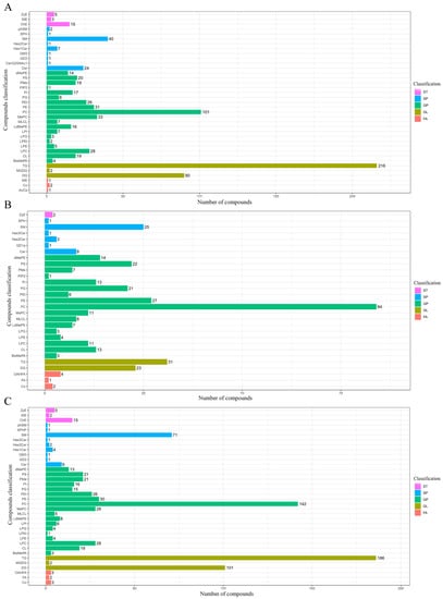 Composition and number of the differentially abundant lipids (DALs; p ≤ 0.05 and VIP ≥ 1 of lipid species) in pike eel samples. (A) simple-packaged (SP) vs. fresh (FE) pike eels. (B) vacuum-packaged (VP) vs. fresh (FE) pike eels. (C) simple-packaged (SP) vs. vacuum-packaged (VP) pike eels.