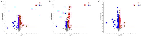 Volcano plot of lipid profiles identified in pike eel samples. (A) simple-packaged (SP) vs. fresh (FE) pike eels. (B) vacuum-packaged (VP) vs. fresh (FE) pike eels. (C) simple-packaged (SP) vs. vacuum-packaged (VP) pike eels.