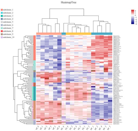 Hierarchical cluster and heat map analyses of the DALs (top 100 species) in fresh (FE), simple-packaged (SP), and vacuum-packaged (VP) pike eels. Each color block on the heat map corresponds to the abundance of different lipid species. Red (2) represents a relatively high abundance of lipids, and blue (−4) indicates a relatively low abundance of lipids.