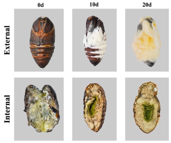 The tissue of the pupa infected by S. hepiali was thoroughly changed (Figure 1). The external surface of the pupa first appeared with a few white-colored mycelia, and as time passed, the mycelia on the surface of the pupa further grew and the color gradually changed to yellow. The internal tissue was transformed into a solid and yellow-brown hard body, and the mycelia gradually replaced more and more areas of the tissue. Additionally, the water content decreased to a visually evident degree.