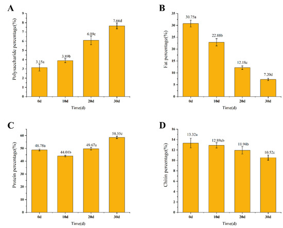 Nutritional dynamics of insect fungus complex. (A) Polysaccharide content. (B) Fat content. (C) Protein content. (D) Chitin content. Data are presented as the mean ± SD. Means with different superscripts in the column differ significantly (p ≤ 0.05). n = 3.
