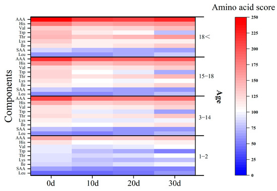 Except for the initial stage, the protein content of the insect–fungus complex generally increases, and the protein content becomes more abundant. However, if we consider the amino acid composition, the discussion becomes more complex. During a month-long infection, the increase in total protein content is primarily due to the increase in NEAA, while the relative content of EEA, which is more important for humans, has decreased compared to the initial stage. It can be found that the highest values of a different single amino acid mainly occurred at 0 d and 30 d after infection, indicating that the infection of S. hepiali caused the continuous increase in the content of some amino acids while the content of some other amino acids continuously decreased; this feature can provide dietary guidance for people with different amino acid needs. The value of the EAAI (essential amino acid index) reflects the reasonableness of the composition of essential amino acids in foods. The closer the EAAI value to 1, the higher the nutritional value of protein in foods [37]. Therefore, from the perspective of the EAAI, the infection of S. hepiali slightly reduces the protein quality of the pupa. In addition, amino acid scores were obtained for pupae at different stages of infection based on the amino acid scoring pattern for infants, children, adolescents, and adults from the 2007 WHO/FAO/UNU report [38]. It is clear that both the pupae and the insect fungus complex are more suitable for adult consumption, with the S. hepiali infection allowing the scores of each amino acid category to fluctuate (Figure 3). After 10 days of infection, the total amount of protein in the pupa increases, but the quality of the protein slightly declines.