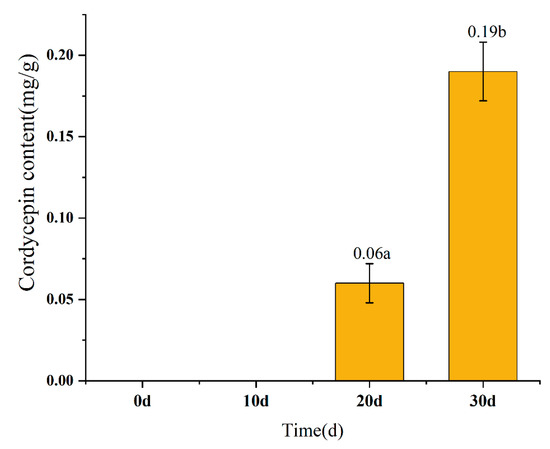 The dynamic changes in cordycepin quantity. Data are presented as the mean ± SD. Means with different superscripts in column differ significantly (p ≤ 0.05). n = 3.