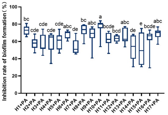 LAB significantly inhibited P. aeruginosa’s ability to form biofilms (Figure 1). Among them, H1, H6, H8, H10, and H17 showed higher inhibition of P. aeruginosa film formation, with H10 showing the strongest inhibition.
