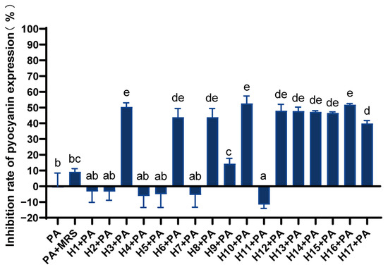 Inhibition rate of LAB against P. aeruginosa pyocyanin expression. Differences are indicated by different superscript lowercase letters in the same column (p < 0.05). Statistical analysis was performed to determine significant differences (p < 0.05) between the results using Student’s t-test or ANOVA followed by Tukey’s post hoc test.