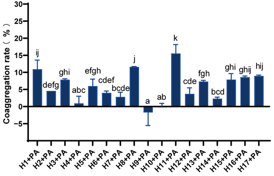 There were significant differences in the co-aggregation rates of different LAB with P. aeruginosa (Figure 3). Strains H1, H8, and H11 had a strong co-aggregation capacity with co-aggregation rates above 10%, and in particular, strain H11 had the strongest co-aggregation activity of 15.52%. The coaggregation ability of strains H3, H5, H13, H15, H16, and H17 with P. aeruginosa was moderate, while that of H4, H9, and H10 was weak.