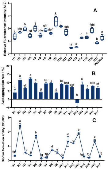 The formation of biofilms can help beneficial microorganisms to resist the stress of unfavorable environments and resist antibiotics, thus achieving the effect of being engulfed by the immune system. Additionally, the aggregation of probiotics can also be carried out through biofilm formation, which greatly improves the activity and stability of strains; thus, research on biofilms is of great value in improving the probiotic properties of LAB. Different LAB strains differ significantly in biofilm formation (Figure 4B). Most of the 17 LAB strains could form biofilms, with strains H2, H5, H13, H11, H12, and H16 having a strong ability.