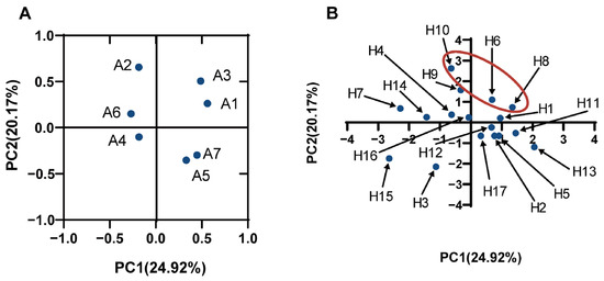 PCA analysis of various characteristics of LAB ((A) represents the factor load plot, A1 represents the inhibitory ability of LAB on P. aeruginosa growth; A2 represents the AI-2 fluorescence intensity of LAB supernatant; A3 represents the inhibitory ability of LAB on biofilm formation of P. aeruginosa; A4 represents the expression of chloropropria co-cultured with P. aeruginosa; A5 represents the coagulation capacity of LAB and P. aeruginosa; A6 represents the self-aggregation ability of LAB; A7 represents the ability of LAB to form biofilms; (B): represent the factor scoring plot, H1–H17 represents the LAB strains).